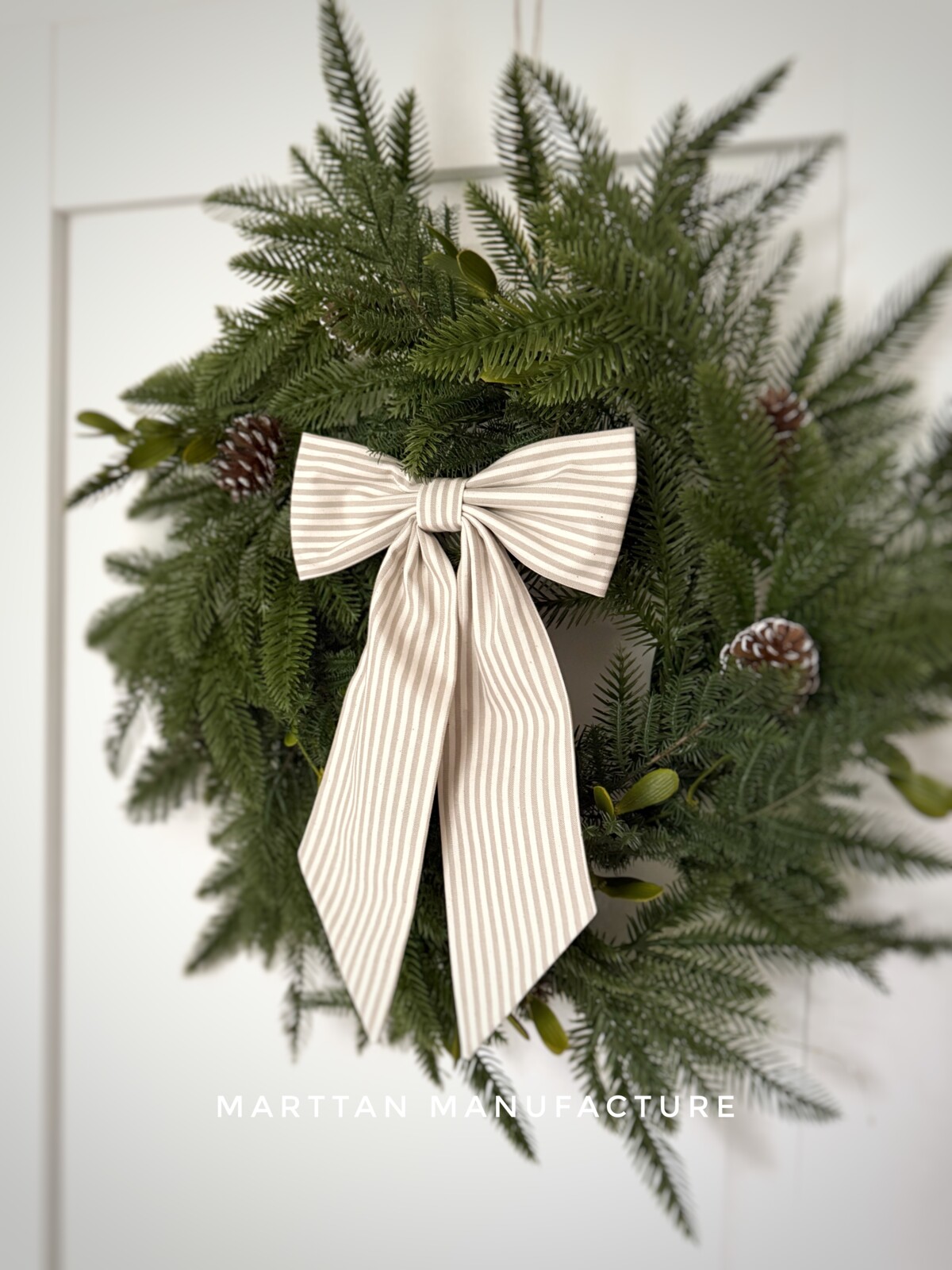 Látková mašle s pruhy. Krásná textilní mašle, která dodá vašemu interiéru jemný dekorativní akcent. Vhodná na zavěšení na věnec, kliku, vánoční stromeček nebo jako ozdoba dárku. Ručně šitá v našem studiu Marttan Manufacture z kvalitní bavlněné látky. Barvy: šedá, zelená, červená, béžová Rozměr: cca 37 x 20 cm Každá mašle je originál .
