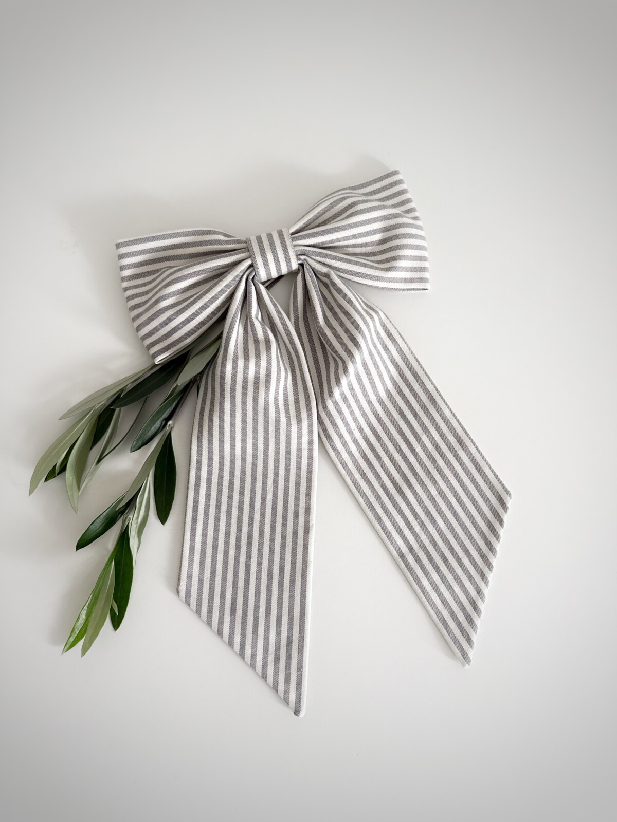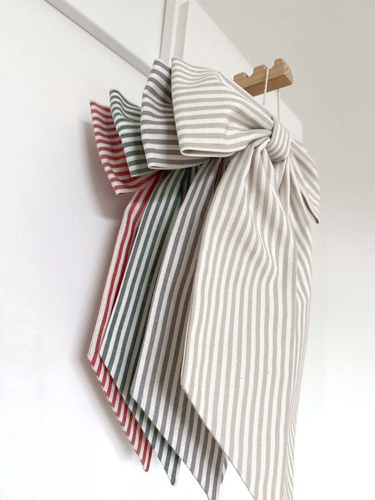 Látková mašle s pruhy. Krásná textilní mašle, která dodá vašemu interiéru jemný dekorativní akcent. Vhodná na zavěšení na věnec, kliku, vánoční stromeček nebo jako ozdoba dárku. Ručně šitá v našem studiu Marttan Manufacture z kvalitní bavlněné látky. Barvy: šedá, zelená, červená, béžová Rozměr: cca 37 x 20 cm Každá mašle je originál.